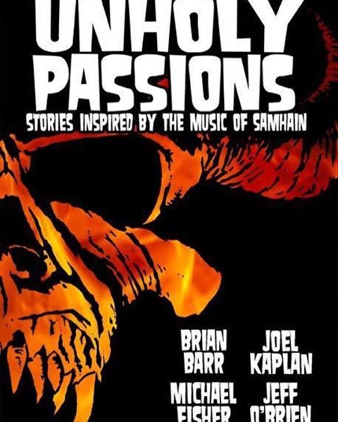 Cover of Unholy Passions, an upcoming collection of four novellas by Brian Barr, Michael Fisher, Joel Kaplan and Jeff O’Brien, inspired by the music of Samhain #EpicFishTales #horrorpunk #Samhain #horror #UnholyPassions